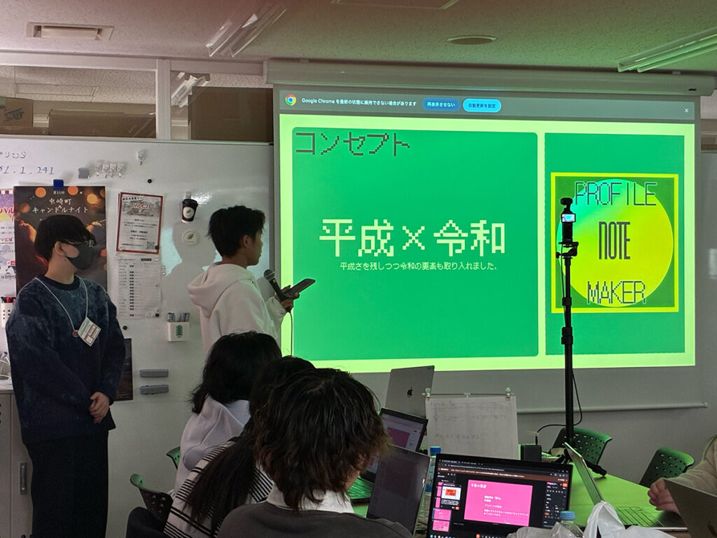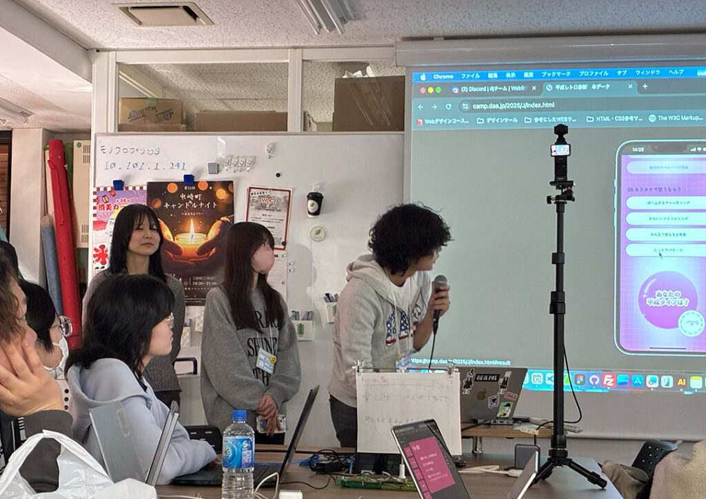 完成した作品には、バーコードの読み込みや平成診断、デジタルを用いたシール帳など、学生らしい発想が随所に盛り込まれていました。カメラを起動させる機能や、JavaScriptをうまく活用したサービス設計など、どのチームも工夫が凝らされており、短い制作期間とは思えないほど完成度の高いものばかりで、大いに感心させられました。